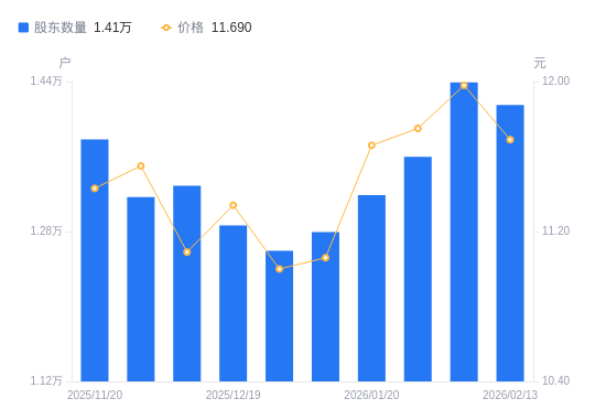 近一年(2025年2月20日至2026年2月13日),春雪食品A股股东户数从1.65万户,减低至1.41万户,降幅14.11%,区间股价上涨36.09%。