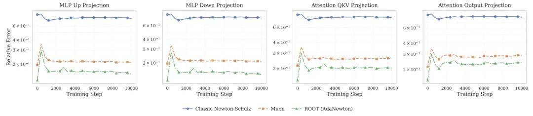 而更深入分析显示,Muon 由于采用固定系数,在训练过程中存在较大的近似误差;而 ROOT 凭借自适应系数,始终保持着更接近真实 SVD 的正交化精度 。