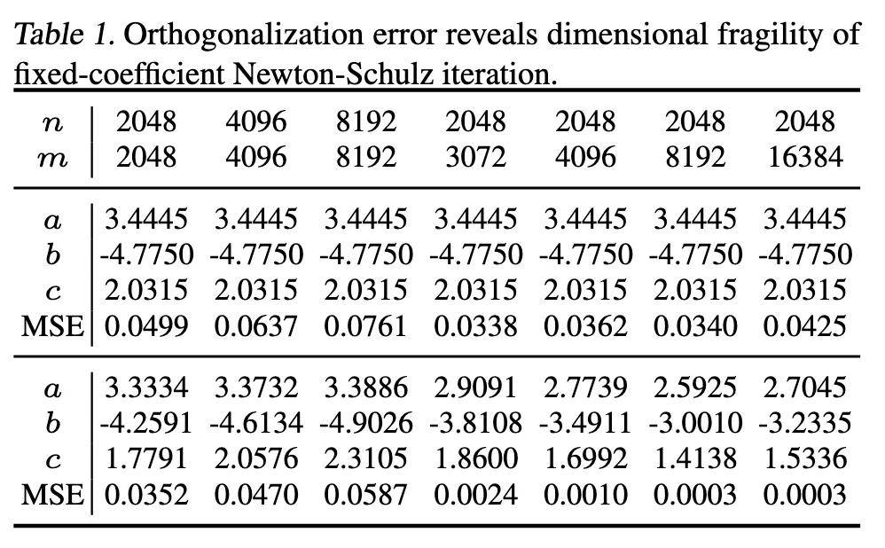 为了解决这种维度脆弱性并构建维度鲁棒的正交化过程,研究者们提出了具有细粒度、特定维度系数的自适应 Newton-Schulz 迭代(AdaNewton)。