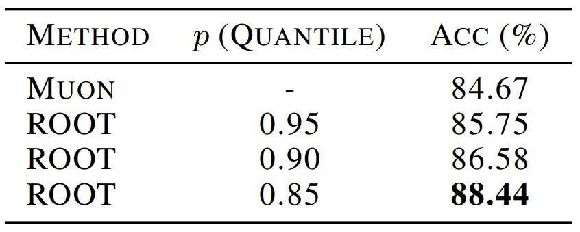 特别是在引入软阈值机制后,ROOT 能够有效抑制视觉数据中的梯度噪声,取得了 88.44% 的 Top-1 准确率,显著优于 Muon 的 84.67% 。这表明 ROOT 的「去噪+正交化」范式具有极强的跨领域普适性。