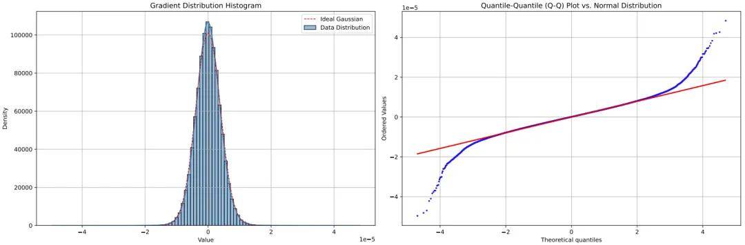 随机梯度中异常值噪声的概念可视化。大多数梯度值集中在中心附近,存在一个高幅度异常值的尾部。这些异常值会不成比例地影响优化过程。
