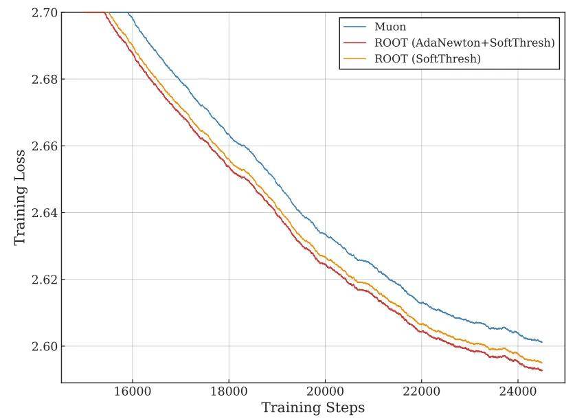 如上图所示,在 10B token 的大规模预训练实验中,两个 ROOT 变体(仅软阈值版与完整版)的训练损失均始终保持在 Muon 的 Loss 曲线下方。最终,ROOT 的训练损失达到 2.5407,比 Muon 基线低 0.01。