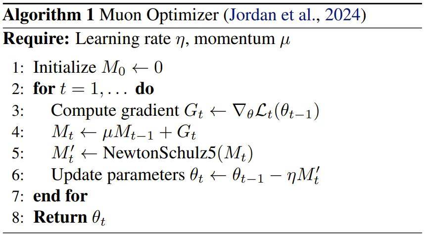 Muon 不再仅仅盯着单个参数,而是将权重矩阵视为一个整体。它利用 Newton-Schulz 迭代对动量矩阵进行正交化处理,从而在不增加额外计算复杂度(保持 O (N))的前提下,规范了更新的几何结构。