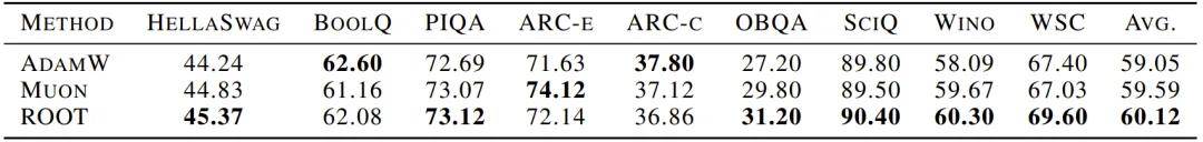 在多项下游任务基准上,ROOT 也带来了全面的提升:ROOT 取得了 60.12 的平均分,不仅击败了传统霸主 AdamW(59.05),也超越了其直接竞争对手 Muon(59.59)。