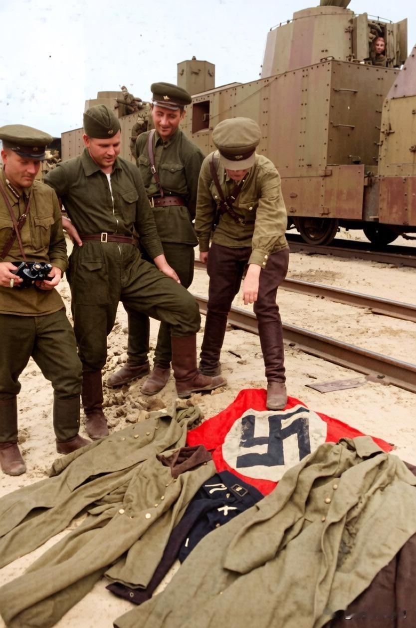 几名苏军正在查看他们的战利品,其中一名士兵一脚踩着一面纳粹旗帜。他们的身后是一列