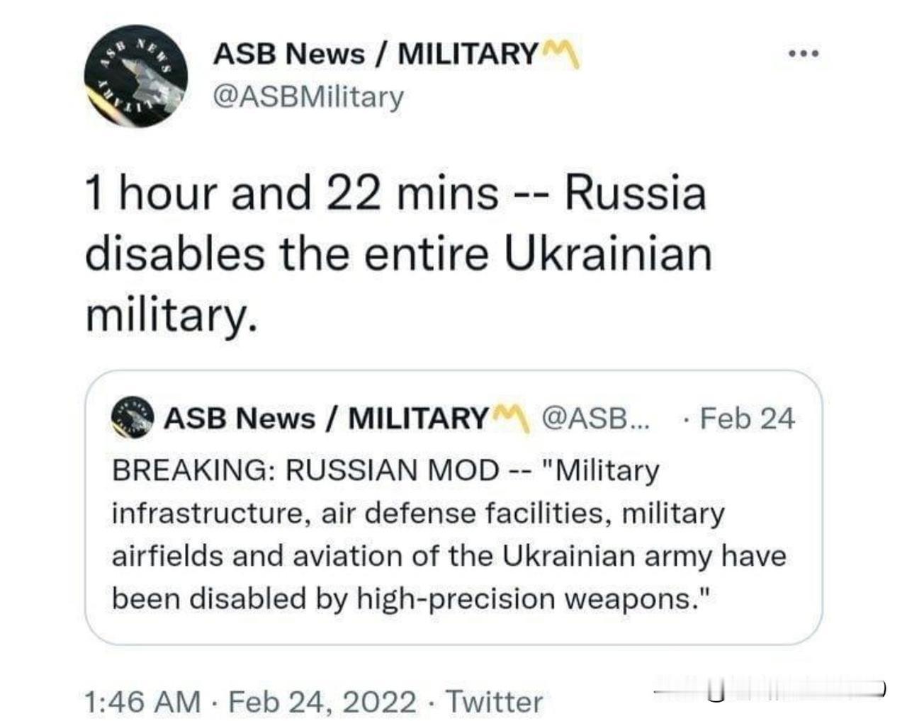 2月24日俄乌新节目:俄罗斯表示,英法准备向乌克兰提供核武器。 法国外交部的账号嘲笑俄罗斯“三天速通乌克兰”,虽然这个“三天速通论”最开始提出来的,实际上是美国米粒将军提出的。 当然,我们这边更进一步,一般都是直接拿“一小时二十二分钟速通论”来嘲笑俄国人,虽然这个说法实际上也和俄国人更没啥关系。