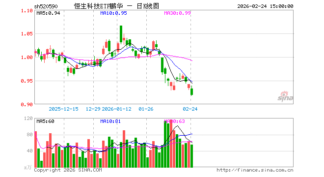 2月24日,恒生科技ETF鹏华(520590)跌2.44%,成交额5040.94万元。当日份额增加2700.00万份,最新份额为2.75亿份,近20个交易日份额增加7600.00万份。最新资产净值计算值为2.55亿元。