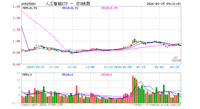 2月25日,人工智能ETF(515980)开盘涨0.00%,报0.923元。人工智能ETF(515980)重仓股方面,中际旭创开盘跌0.72%,新易盛跌0.55%,科大讯飞跌0.80%,寒武纪涨0.79%,金山办公涨0.40%,澜起科技涨0.01%,润泽科技涨1.41%,拓维信息涨1.55%,深信服涨1.70%,芯原股份跌2.92%。