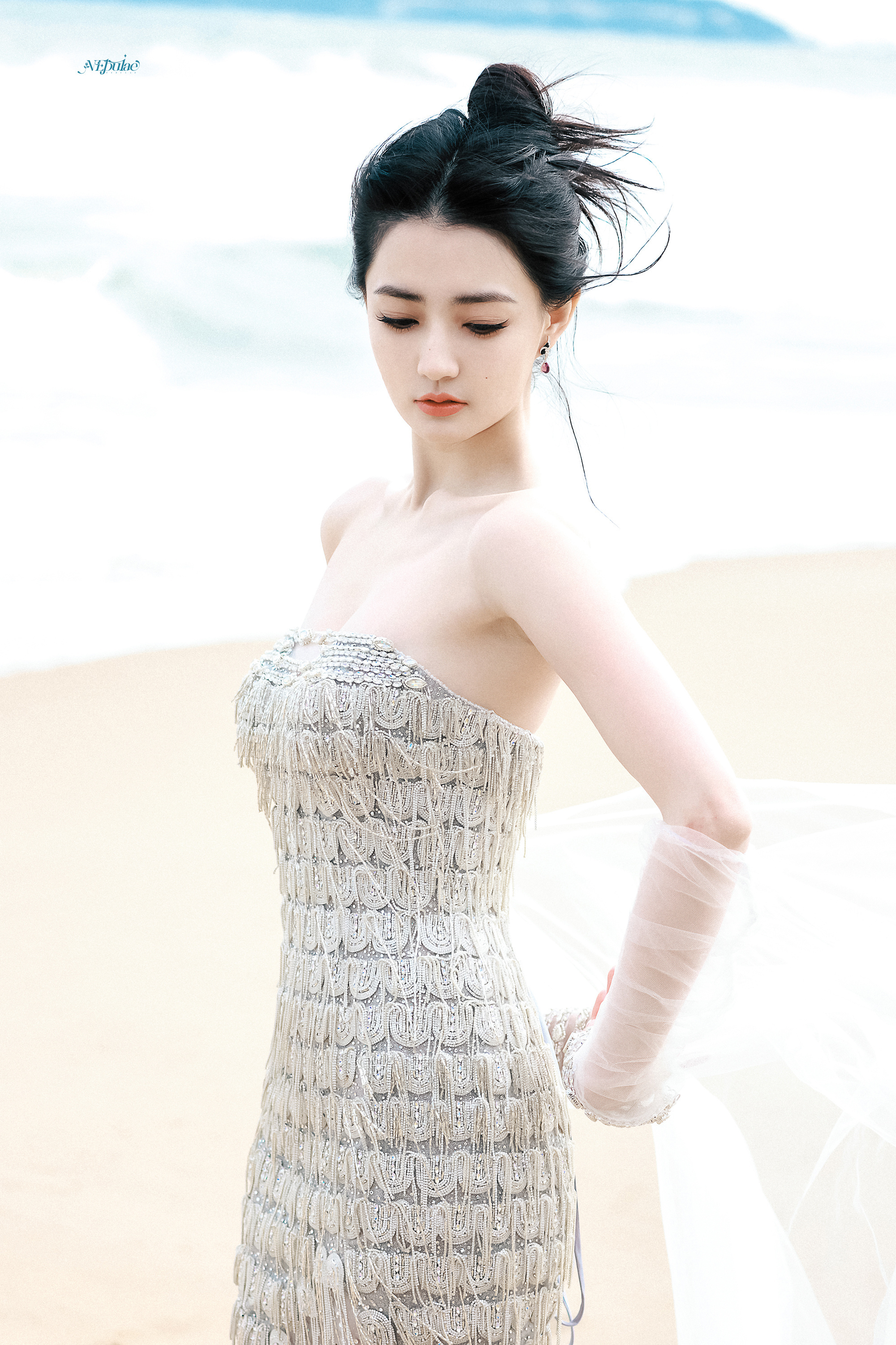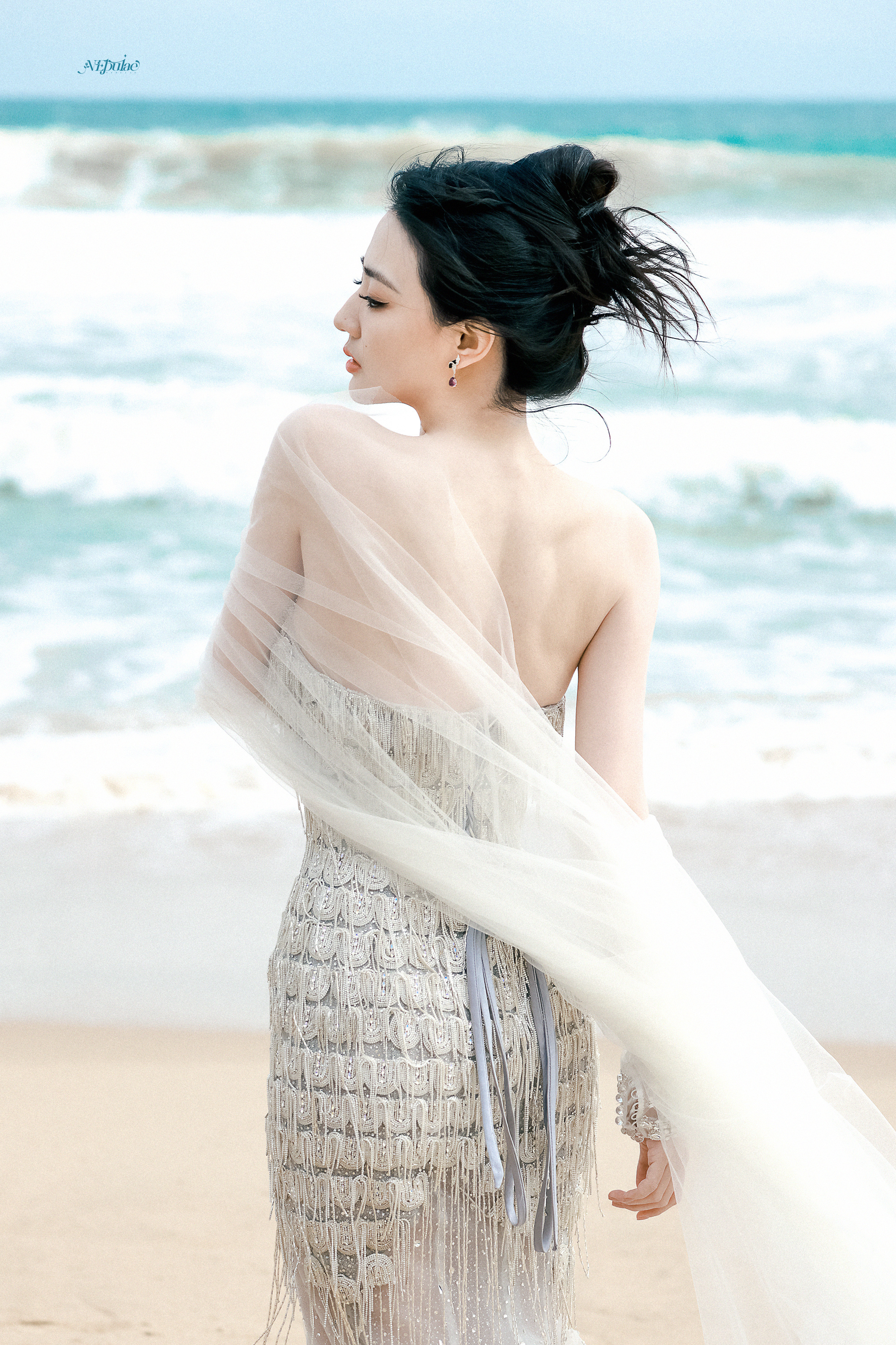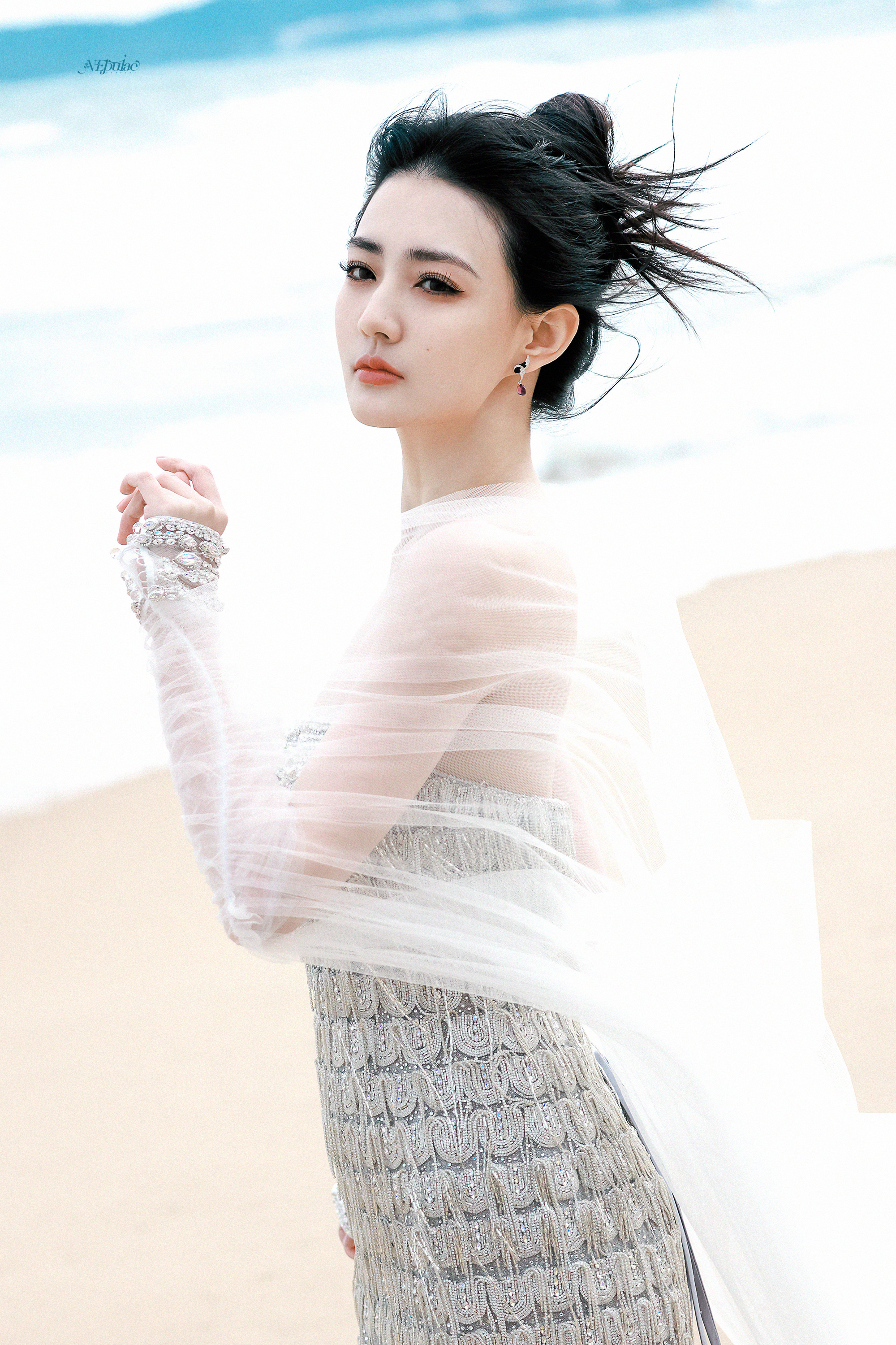 徐璐 海风漫过脚踝,白纱与碎钻在浪尖轻颤。眼底盛着整片海的温柔,发丝被风揉成心动的形状。