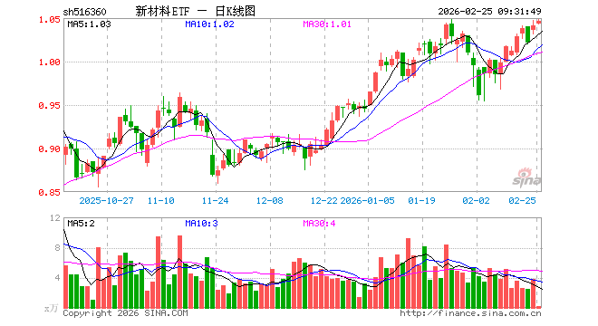 2月25日,新材料ETF(516360)开盘涨0.19%,报1.043元。新材料ETF(516360)重仓股方面,北方华创开盘涨0.23%,宁德时代涨0.48%,万华化学涨0.72%,隆基绿能涨0.22%,华友钴业涨1.06%,天赐材料涨0.00%,三环集团涨3.08%,三安光电涨0.96%,宝丰能源涨0.21%。