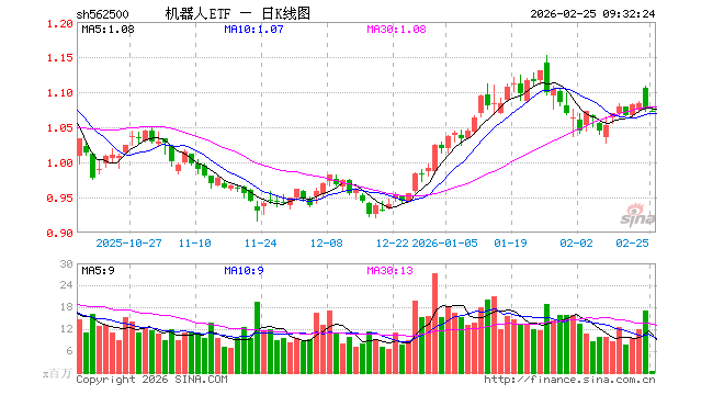 2月25日,机器人ETF(562500)开盘跌0.37%,报1.073元。机器人ETF(562500)重仓股方面,科大讯飞开盘跌0.80%,汇川技术跌0.09%,拓普集团跌0.10%,大华股份跌0.05%,大族激光跌0.39%,双环传动跌0.05%,石头科技涨0.45%,中控技术涨0.76%,绿的谐波跌2.00%,机器人跌0.67%。