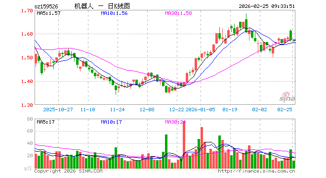2月25日,机器人ETF嘉实(159526)开盘跌0.13%,报1.570元。机器人ETF嘉实(159526)重仓股方面,科大讯飞开盘跌0.80%,汇川技术跌0.09%,拓普集团跌0.10%,大华股份跌0.05%,大族激光跌0.39%,双环传动跌0.05%,石头科技涨0.45%,中控技术涨0.76%,绿的谐波跌2.00%,机器人跌0.67%。