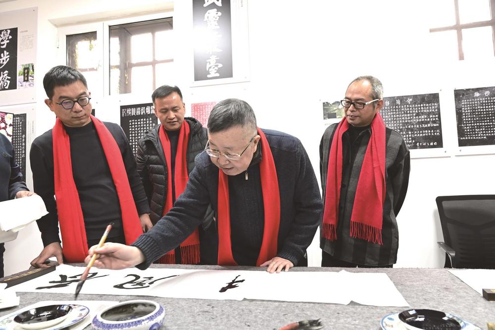 正月初六,“春早邯郸道”——南宫碑书法雅集在邯郸道河北非遗南宫碑书法馆启幕。市文联副主席、邯郸学院南宫碑书法文化研究院院长、南宫碑书法协会主席李喜泰携弟子与嘉宾以笔会友、切磋技艺,现场挥毫泼墨。