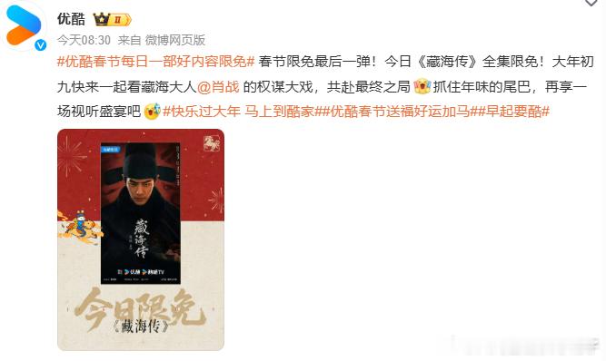 优酷全集限免藏海传藏海传今日全集限免《藏海传》夯爆全网实锤!剧王含金量还在上升,2月25日全天限免,还没看的快冲!