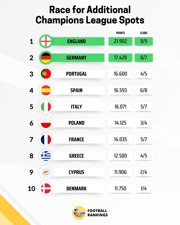 目前个联赛欧战积分方面,英超早已锁定前二,新赛季将有一个额外的欧冠名额,目前德甲积分暂时排名第二。