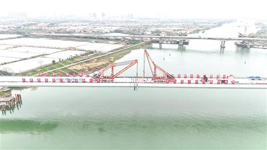 江门日报讯(文/图毕松杰李志强)近日,随着最后一段长6米、宽17米、重约72吨的钢梁精准吊装到位,国内首座大跨度双边主梁混合组合梁高速铁路斜拉桥——深江铁路广中江特大桥跨鸡鸦水道主桥顺利合龙(上图),成为深江铁路全线首个实现合龙的主桥,为全线后续架梁、铺轨等施工奠定了坚实基础。