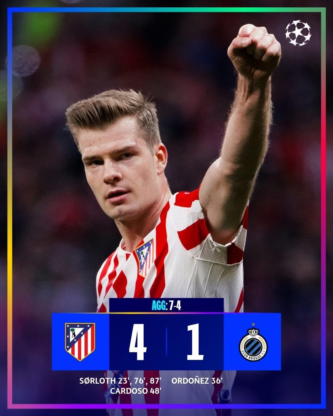 馬德里體育會就憑藉索洛夫嘅帽子戲法,大勝布魯日,兩回合贏7-4晉級。