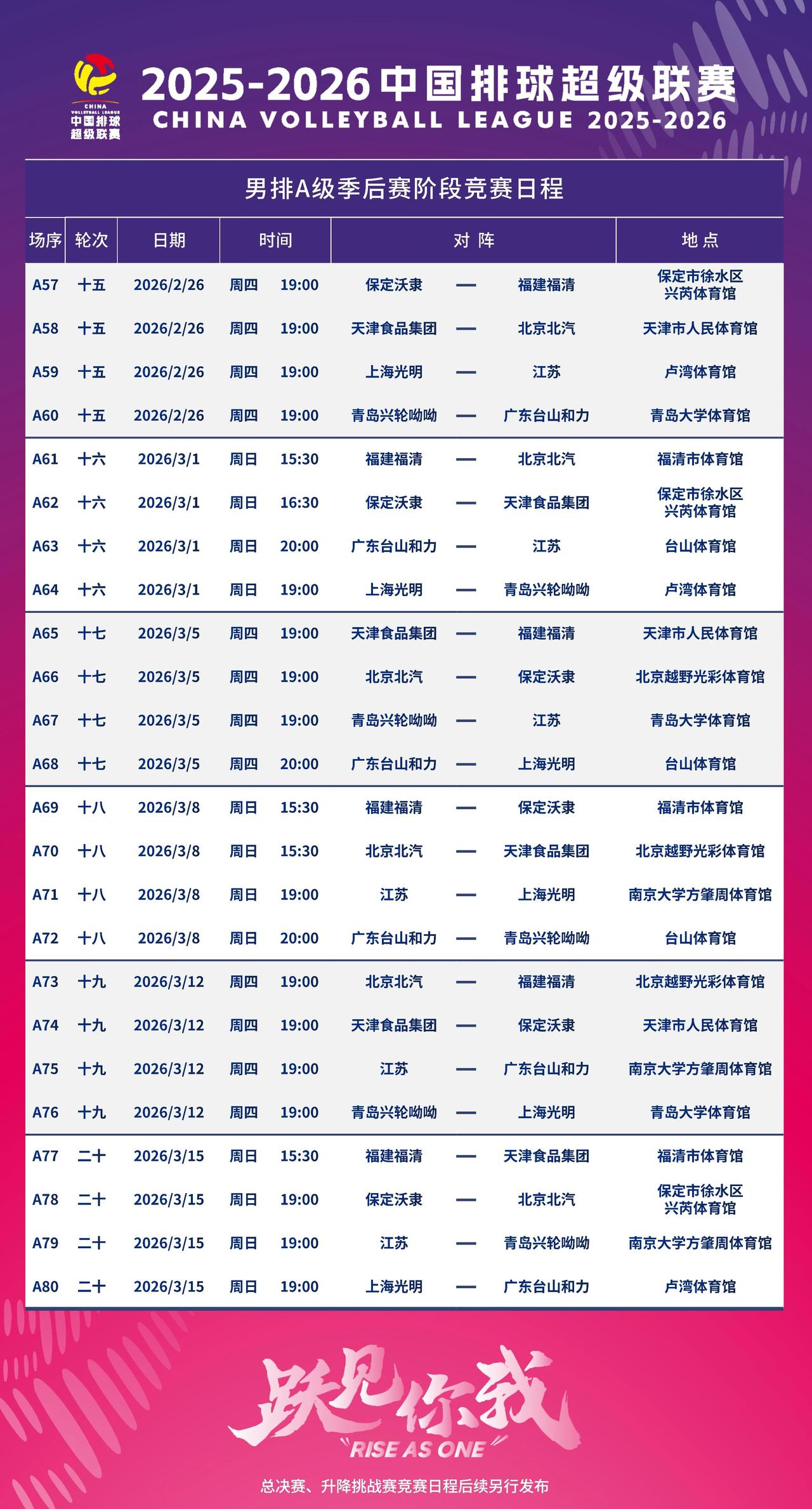 排超年后大战,今天开启 随着今晨结束的欧冠1/8决赛次回合土耳其泽仁体育3-0战胜德国什未林闯进本届欧冠8强,众人瞩目的中国排超季后赛大战也将于今日拉开大幕,今天进行的是女排大战,杀入A级季后赛8强的两组队伍将迎来主客场双循环的首轮较量,A级季后赛小组赛总共进行六轮较量,于3月15日结束。 国外今晚也有几场赛事值得关注。王媛媛效力的加拉塔萨雷将在后半夜1点与法国巴黎圣云进行欧联杯1/4决赛的第二回合较量,首回合加拉塔萨雷3-2获胜,今晚只要战胜巴黎圣云即可晋级,而巴黎圣云只有3-0/3-1取胜才可晋级,与加拉塔萨雷打成3-2则要金局决胜。 同样是后半夜1点,意大利的斯坎迪奇和诺瓦拉将为争夺欧冠8强席位展开第二回合厮杀,上一会回诺瓦拉3-1获胜。接下来3点半,是意大利米兰与希腊奥林匹亚科斯的第二回合较量,米兰获胜应无悬念。 值得一提的是,今年女排欧冠,土耳其共有瓦基弗银行、费内巴切、伊萨奇巴希、泽仁体育4支队伍闯入8强,除去已进入8强的波兰热舒夫,意大利最多只能进去3支。 中国女排超联赛