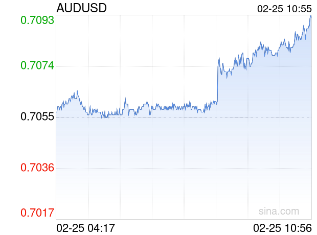 新浪外汇消息2026年02月25日,截至10时55分,外汇市场上澳元兑美元汇率突破1澳元兑换0.7092美元。涨幅为0.5244%