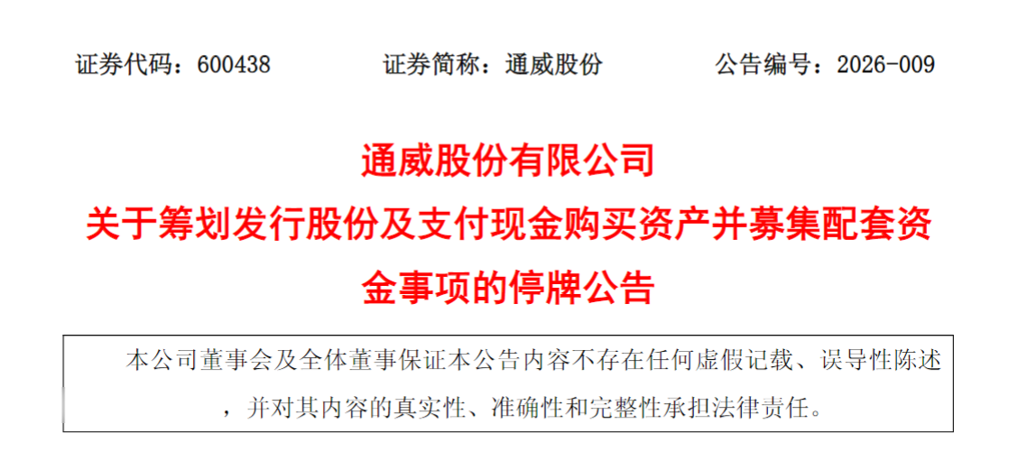 公告显示,通威股份正在筹划通过发行股份及支付现金的方式,购买青海丽豪清能股份有限公司(简称“丽豪清能”)100%股权,并募集配套资金。为保证公平信息披露,维护投资者利益,公司股票、可转债债券以及可转债转股自2月25日起开始停牌,预计停牌时间不超过10个交易日。