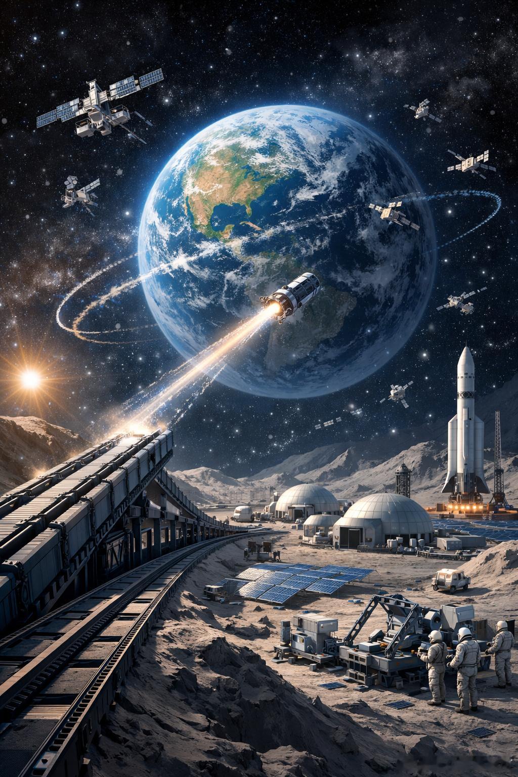 从这个角度看,所谓月球弹弓并不只是一个“发射新花样”,它更像一套战略级基础设施想象。其核心包含两部分。第一部分是在月球表面建立卫星制造或组装能力,尽量把制造环节前移到发射端,减少从地球深井里把完整成品一件件送上去的成本压力。第二部分是建设大型电磁弹射系统,用电能驱动载荷加速,把卫星或部件送入目标轨道体系。前者解决生产位置问题,后者解决运输效率问题,两者组合起来才有“系统性降本”的可能。