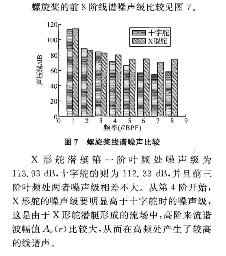 然而,在改善艇艉尾流场并降低宽带水动力噪声的同时,X形艉舵反而会显著增加潜艇的叶频线谱噪声,尤其体现在高阶叶频处:在该文所采用的非均匀尾流模型与推进器参数条件下,X形舵构型在推进器平面产生更显著的角向多极尾流畸变结构,从而增强螺旋桨载荷的周期性调制效应,导致叶频及其高阶谐波线谱幅值高于十字形舵构型。