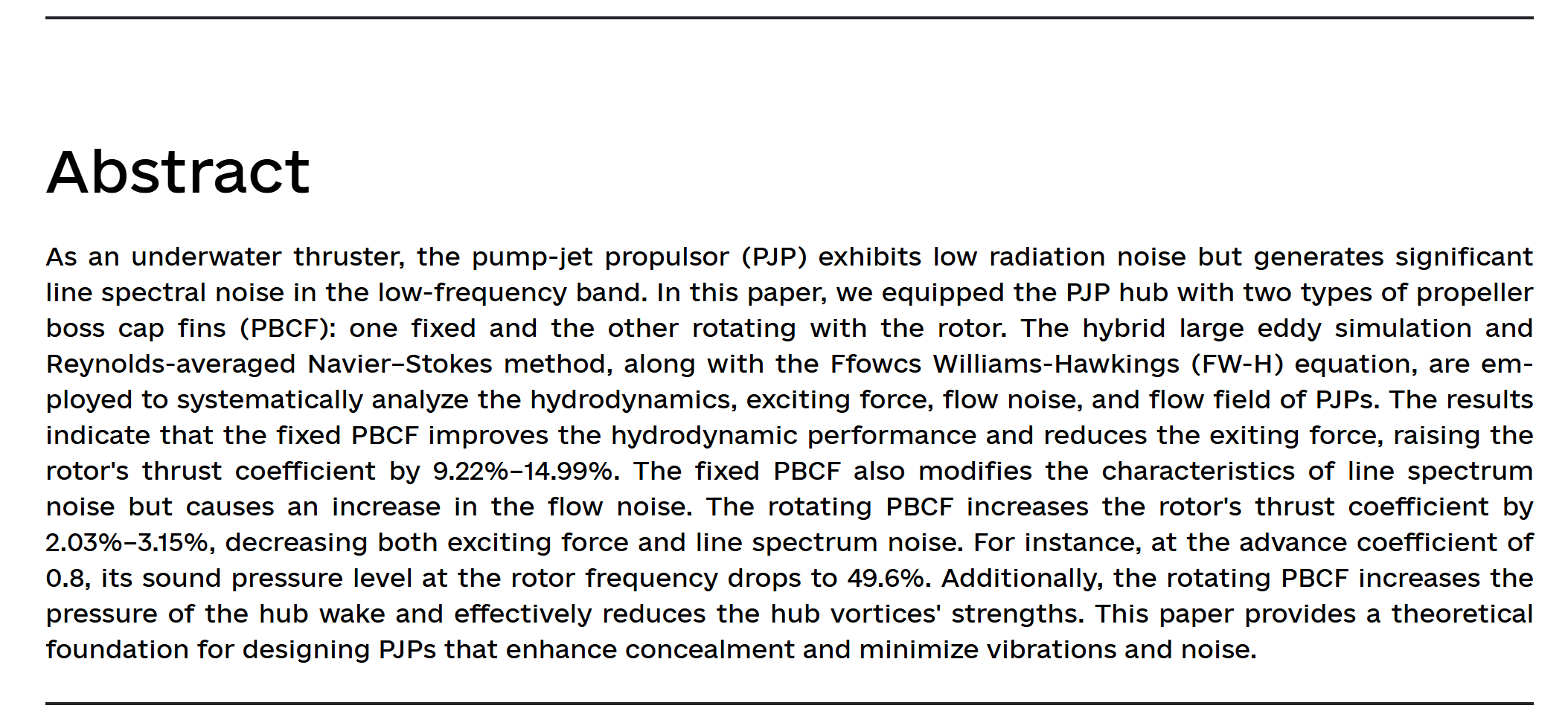 相比于螺旋桨,泵喷在一定程度上能够减少因X舵导致的艇艉伴流不均匀性而导致的螺旋桨线谱噪声,但于2024年发表在顶刊《Physics of Fluids》上的研究明确指出,作为一种水下推进器,泵喷推进器虽然整体辐射噪声低,但在低频段仍然会产生显著的线谱噪声。