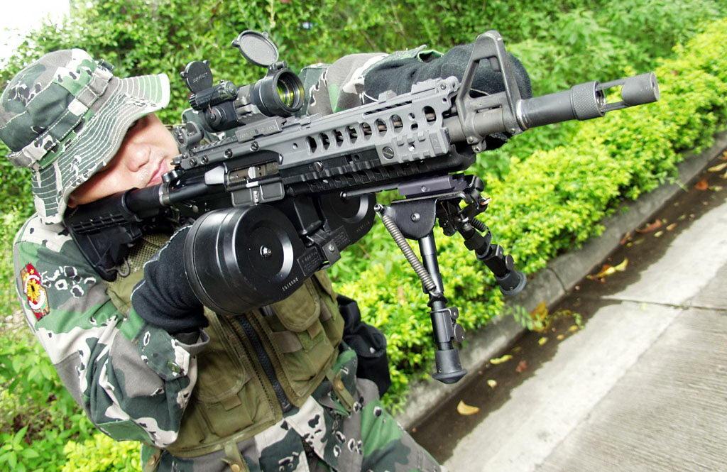 菲律宾SOAR装上两脚架和C-MAG弹鼓充当轻机枪 M16改造版