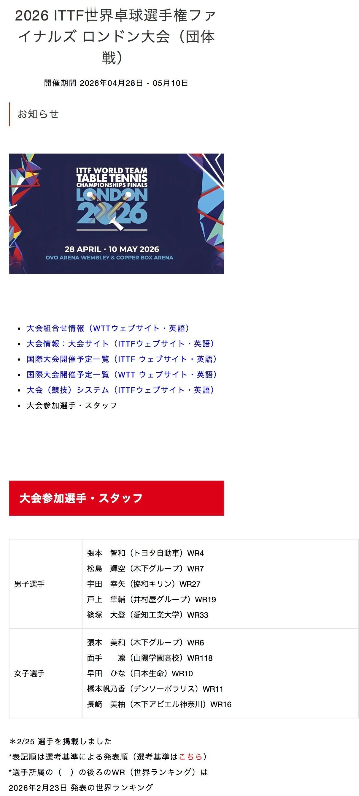 张本智和张本智和2026年伦敦世乒赛 JTTA公布伦敦团体世乒赛参赛选手张本智和