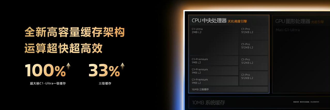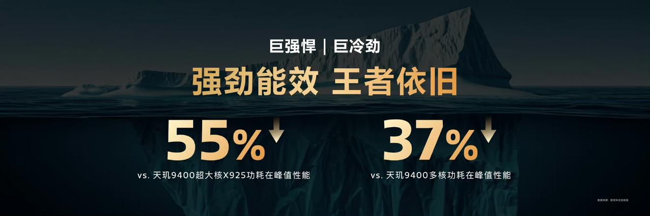 CPU,全新强性能闪存架构,AI 大模型载入速度 +40%,超大核功耗降低 55%,多核功耗降低 37%,采用了业界领先3nm工艺,业界超高300亿+晶体管,相比天玑9400性能提升超过32%。