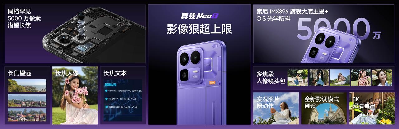 真我 Neo8搭载同档罕见5000万像素索尼OIS潜望长焦,支持3.5倍光学变焦,7X无损变焦、最高120倍超清变焦。