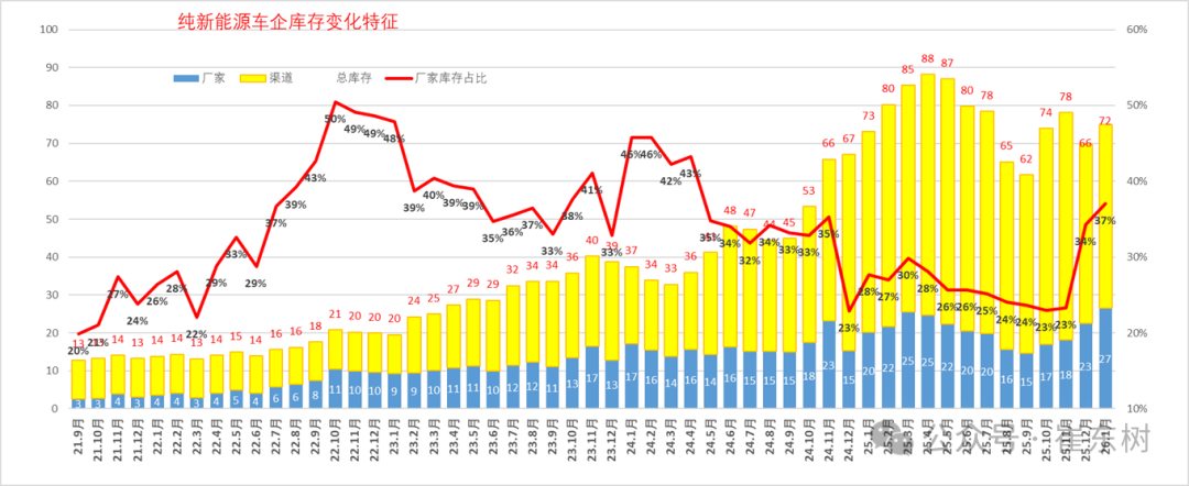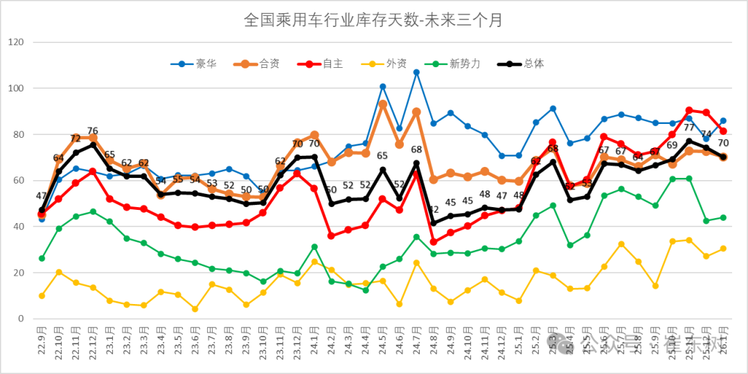 根据未来N+3的月度零售预测测算库存支撑未来天数,因此不是固定的当月数据,库存天数也会随预测调整而变化。2026年1月底的库存与未来销量综合预估的现有库存支撑未来销售天数在70天,相对于2023年1月的65天、2024年1月的70天,2025年1月的48天,今年1月的总体库存压力相对较大。
