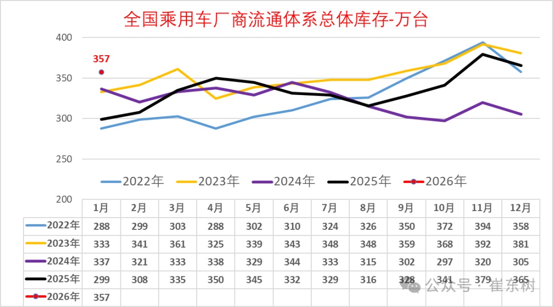 崔东树2月25日发文称,2026年1月月末全国乘用车行业库存357万辆,较上月下降8万辆,较2025年1月增58万辆,形成库存高位运行特征。