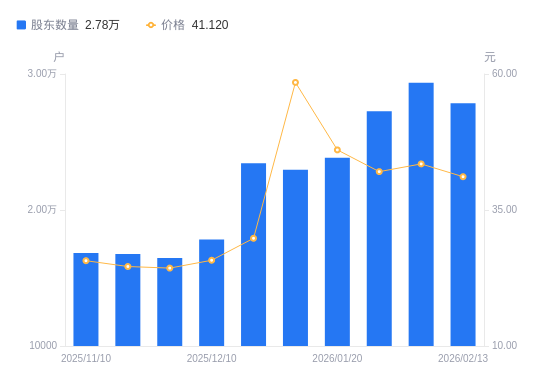 日期A股户数(户)流通A股户均持股数(股)户均持股市值(万元)2026-02-10293522368.6710.302026-01-30272562550.8210.732026-01-20238412916.2013.432026-01-09229663027.3117.692025-12-19234292967.488.842025-12-10178263900.2110.052025-11-28164784219.2710.262025-11-20167584148.7810.212025-11-10168384129.0710.602025-10-31174453985.3910.38