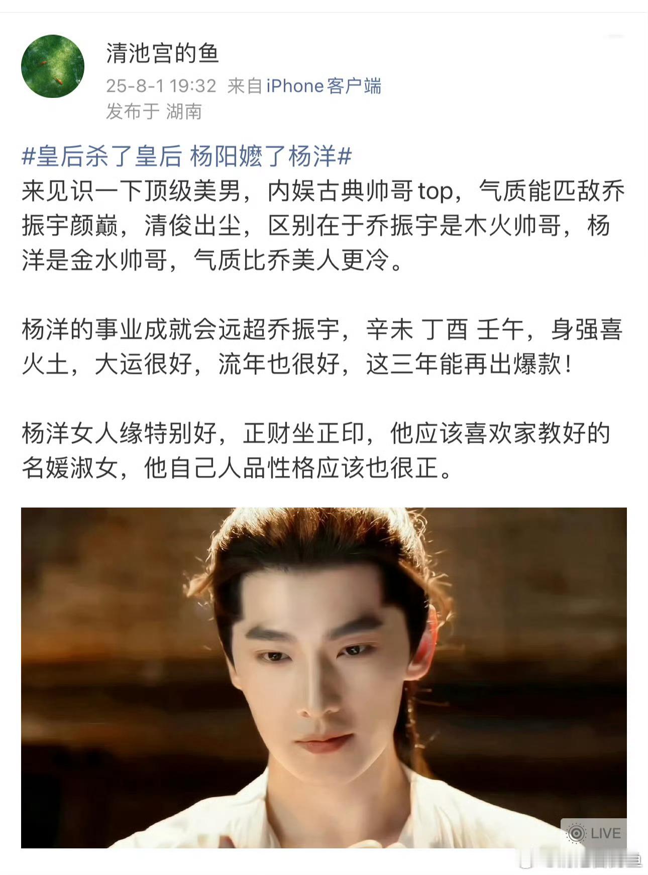 杨洋杨洋这是午午自刑有点麻烦,某个五行太旺了,即使是喜用有时候也会带来一些问题。电影圈抱团太严重,翻来覆去都是那些人演来演去,观众审美疲劳了所以不去电影院了。杨洋形象这么好,又是四大流量仅存的硕果,国民度也够,可是他都这个年纪了,还只能反反复复在偶像剧里打转,还被人欺负成这样。唉,没背景没人脉,好演员难出头,刘亦菲之前也这样。电影圈自己把自己玩完了,反正不需要观众,观众还买票去电影院干啥?