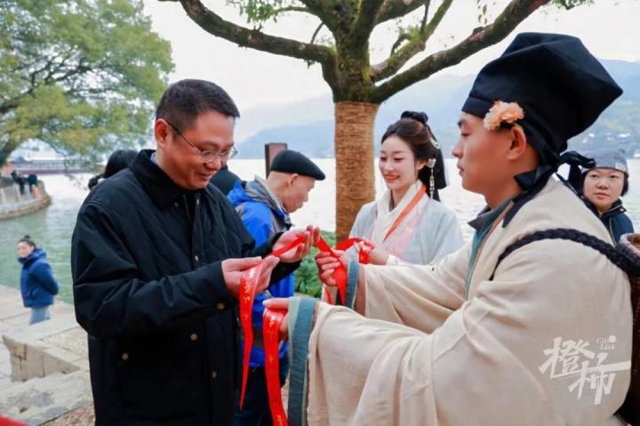 不同的玩法,让传统景区年年都有新面貌。桐君山桐君祠前,由工作人员扮演的老者,与化身“福马”和“花神”的两位NPC沿山道巡游,不时与游客互动合影,一路欢笑不断。