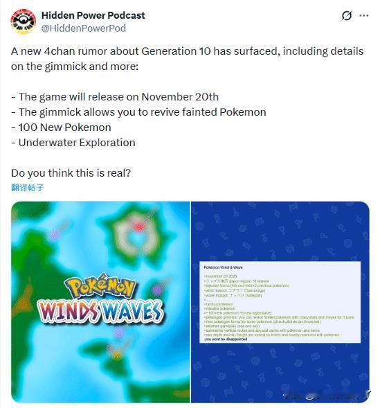 目前国外网友在4chan论坛上发现了有人提供了《风/浪》的新爆料,其中包括其声称的发售日期等,一起来看看吧: 爆料中提到的重要信息: 1.游戏将于11月20日发售; 2.新机制可以让你复活昏迷的宝可梦(指的是玩家对战中); 3.多达100 只新宝可梦; 4.水下探险(与新地图呼应)。