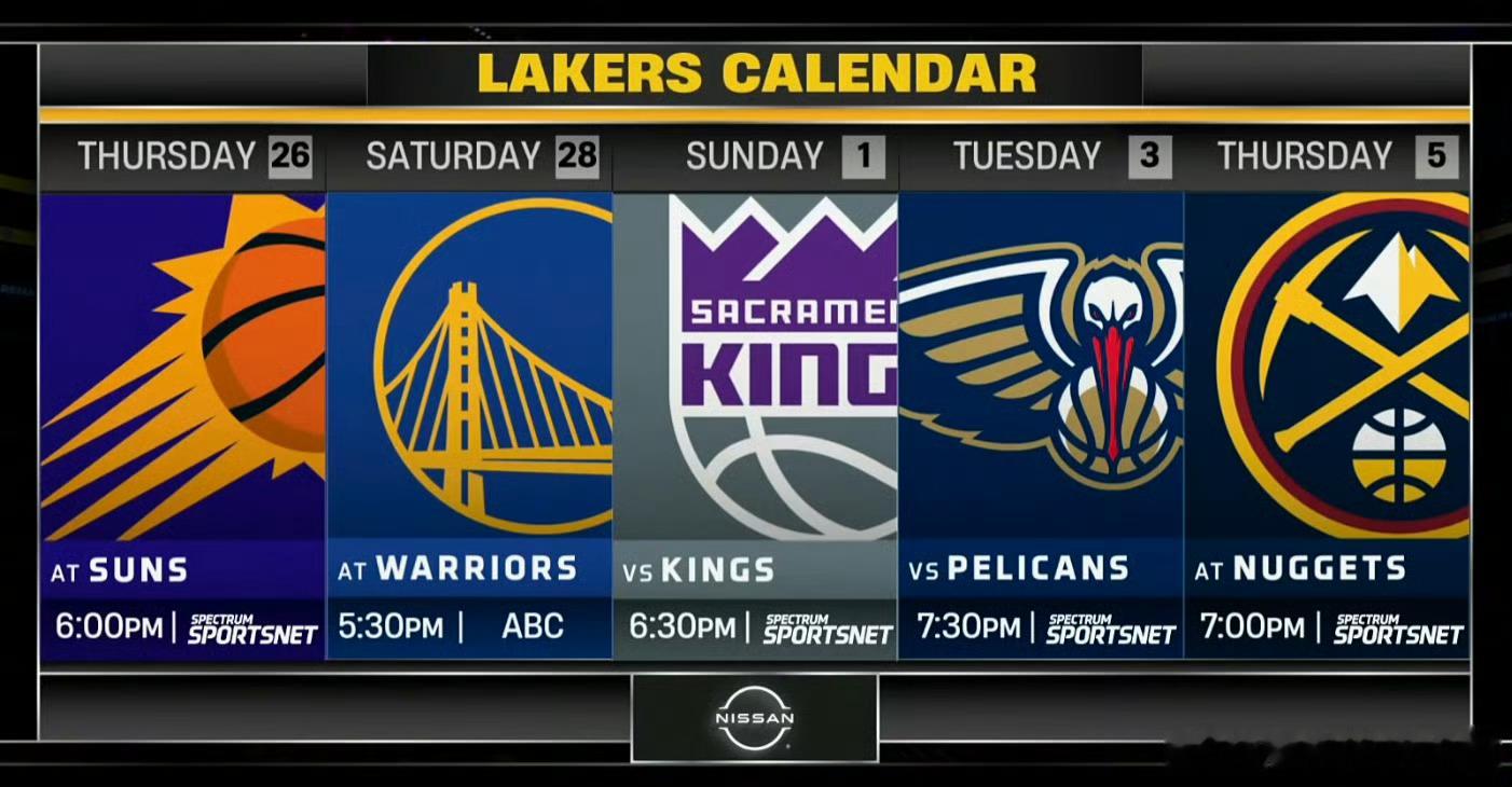 湖人未来5战对手:太阳(客)、勇士(客)、国王(主)、鹈鹕(主)、掘金(客)魔术战胜湖人