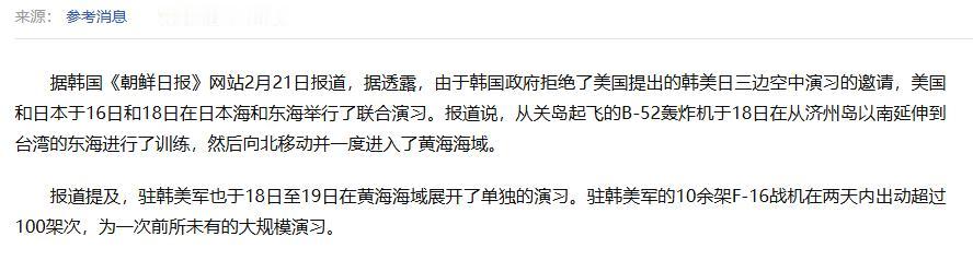 过年期间中美黄海军机对峙事件其实F-16只是护航小角色,后边的大家伙才是主角,怪不得韩国大为恼火,后果太严重。 据韩国《朝鲜日报》网站2月21日报道,据透露,由于韩国政府拒绝了美国提出的韩美日三边空中演习的邀请,美国和日本于16日和18日在日本海和东海举行了联合演习。 报道说,从关岛起飞的B-52轰炸机于18日在从济州岛以南延伸到台湾的东海进行了训练,然后向北移动并一度进入了黄海海域。 报道提及,驻韩美军也于18日至19日在黄海海域展开了单独的演习。驻韩美军的10余架F-16战机在两天内出动超过100架次,为一次前所未有的大规模演习。 报道称这一行动立即引发中方强烈反应——解放军紧急出动战机升空应对,中美战机在黄海上空形成近年来少有的大规模编队对峙。 很多大V津津乐道J-16轻松压制F-16老旧机型,甚至有人说应该用J-10C足可以压制。但我们为什么会出动大批J-16来拦截呢,因为我们的目标不只是F-16,还有附近的B-52。 1、B-52出现在黄海位置极为敏感 黄海被称为"中国京畿门户",美军的B-52战略轰炸机一旦进入黄海,其作战半径(5500公里)加上AGM-158巡航导弹射程(约1000公里),打击范围可覆盖北京、天津、上海、山东、江苏等中国核心政治经济区域。 这行为是在我们心脏地带武装示威。虽然美方声称演习针对朝鲜,但朝鲜空军才多大威力,根本无需动用B-52战略轰炸机和如此大规模的F-16编队。 2、我方全程监控,应对周全 根据公开媒体报道,整个对峙过程历时2个多小时,美军战机接近中国东海防空识别区边缘,触发解放军"依法依规全程跟监警戒"。 同时派出歼-16拦截也是精心安排,歼-16作为我方重型多用途战机的代表,不仅在挂载能力占据优势,依托国内成熟的电科系统,实现了态势感知能力的全面升级,更重要的是航程远、作战半径大的优点,可以确保长时间滞空监控。 3、美日此次联合行动意图 B-52接近黄海真正目标是: -测试中国防空反应速度,收集电子情报 -美日(韩)联合演练,测试三方联合作战模式在"第一岛链"内的介入能力。 而美军B-52直接飞临黄海区域,是对我主权安全的直接威胁。 双方实际对峙现场形势远比报道的凶险。 4、韩方反映的意图 从目前看是韩方主动爆出的消息,而且韩方拒绝参加美日韩联合演习。 主要是韩国明白这种演习的敏感性 ,黄海对峙发生在韩国周边海域,一旦擦枪走火,韩国将首当其冲承受安全与经济双重打击。 李在明不想担心被拖入中美冲突,也不想破坏中韩关系,2026年1月李在明政府刚释放修复对华关系信号,强调"经济交流"重要性 美军在黄海挑衅中国,可能让韩国的外交努力付诸东流。 据韩媒消息,今天布伦森司令最终向韩方道歉,并提前叫停22日的训练,显示美方意识到:过度施压可能适得其反,将韩国推向战略自主甚至中立。