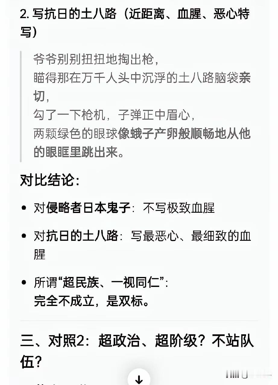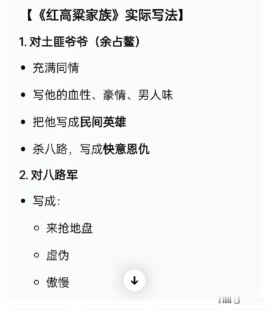莫言双标现场曝光!不唱赞歌只针对谁?红高粱细节越看越心寒 全网吵翻!莫言那句“文学从不是唱赞歌工具”火遍全网,他还反复宣称80年代起就站在人格写人性、不受党派束缚。可这番“文学宣言”背后,竟藏着让人细思极恐的双标操作,骂战越演越烈,没人能撼动他的创作底色。 诺奖演讲与公开访谈里,莫言把“不唱赞歌”挂在嘴边,可笔下的人物待遇天差地别。对中国军队的讽刺拉满,对土匪和日军却格外“留情”,所谓的中立人性,不过是选择性偏袒。 《红高粱家族》里,莫言口口声声要平等刻画土匪、日军、八路军,实际操作完全相反。日军被塑造成温文尔雅的形象,毕恭毕敬喊他奶奶大奶奶、姑姑二姨太,私下的关照细节藏在文字里,连相处氛围都透着体面。土匪余占鳌直接被捧成血性豪情的民族英雄,从头到尾都被赋予正面魅力,连长辈都对他敬重有加。 反观八路军,通篇被贴上“土八路”标签,被写成不积极抗日、抢狗皮夺武器、抢土匪地盘的强盗队伍,没有一丝正面刻画。书中最刺眼的片段,爷爷瞄准八路军头部时动作亲切,子弹正中眉心后,绿色眼球像蛾子产卵般从眼眶跳出。这样血腥又刻意的特写,只给八路军,写日军和土匪的死亡,全是远距离一笔带过,连杀人动作都被赋予温情色彩。 同样是战争角色,土匪有血有肉有魅力,日军有人性有体面,八路军只剩傲慢虚伪的标签,没有人格没有情感,只剩赤裸裸的讽刺与侮辱。这就是莫言口中的“站在人格写人性”吗? 所谓不唱赞歌、超党派的文学追求,根本是糊弄读者的漂亮口号。这样的创作手法,到底是文学自由,还是刻意的历史偏见,看完你心里自有答案。 你觉得这样的“文学表达”,真的能站得住脚吗