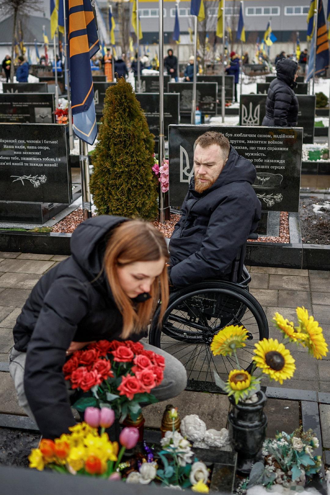 当地时间2026年2月24日,乌克兰基辅州布恰镇,一对夫妇在当地公墓的英雄大道献花,悼念受害者。图/ICphoto