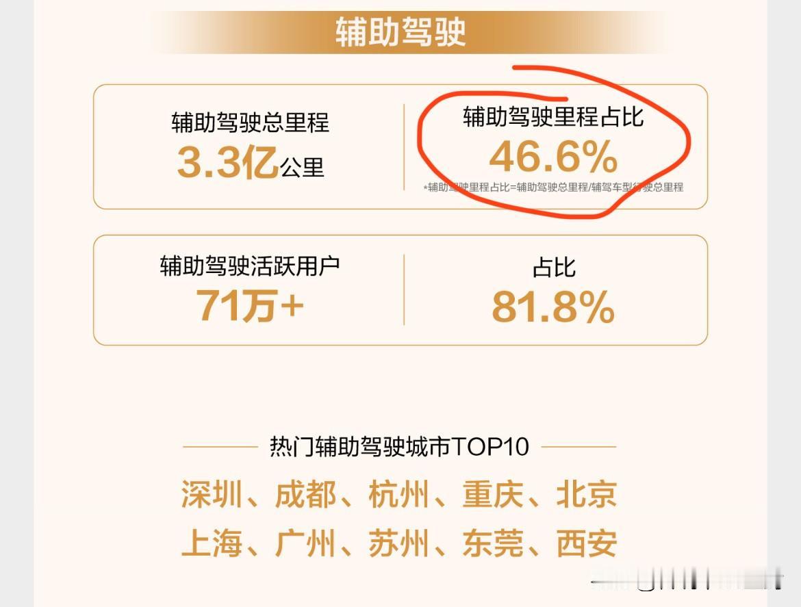 问界也公布了春节出行报告。 其中,我认为最重要的一个数据是,辅助驾驶的里程占比: 高达46.6%,也就是所有问界辅驾车型接近一半的路程都在用辅助驾驶(图二)。 这绝对是很高很高的数据了,也确实和最近路上实际看到问界“小蓝灯”的情况对得上,相较于其他品牌,问界“小蓝灯”出现的概率确实是最高的。 绝大多数车主愿意用,这绝对是车辆真实辅助驾驶水平的最大背书…… 不知道其他车企有没有公布类似的数据,如果有的话可以对比一下。 其他的,像主动安全、辅助泊车的使用(触发)次数,就比较常规了。 今年L3和L4肯定会更频繁的被提及,希望更高水平的自动驾驶能更快到来……