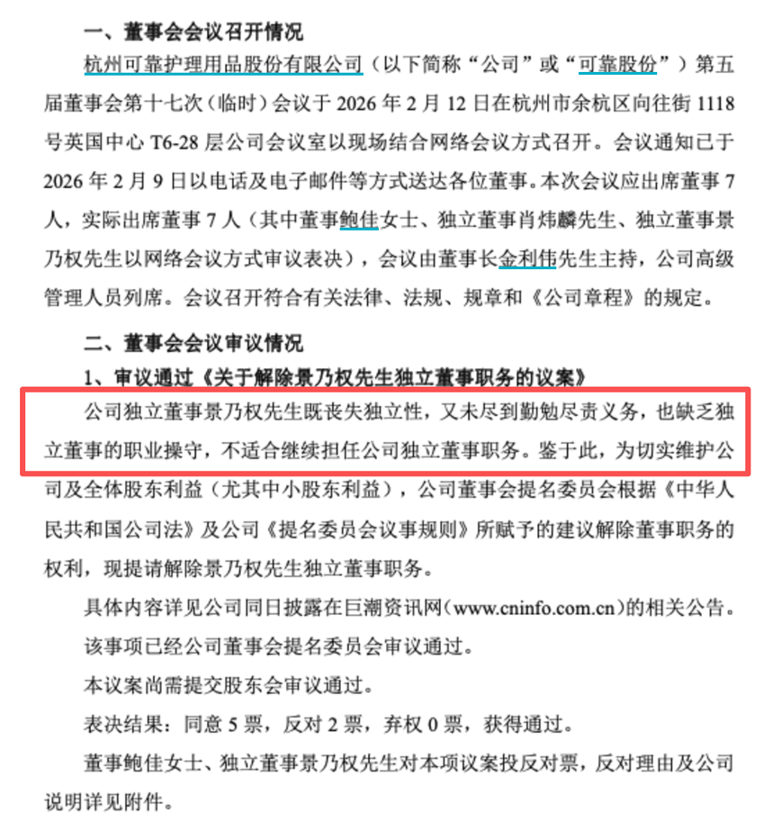 核心导火索是2025年12月23日薪酬委员会审议鲍佳薪酬事项时,景乃权在已知鲍佳2025年未实际到岗的情况下,仍要求将其高额报酬定性为“无责津贴”,并发表极端言论。可靠公司指出,景乃权先生角色已从“独立的监督者”异化为“特定股东利益代言人”“已与鲍佳董事形成实质性立场结盟”。