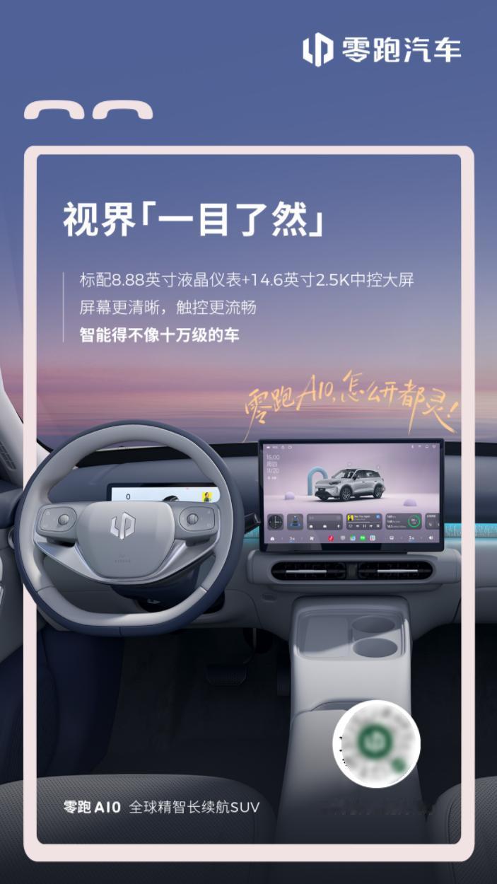 【零跑A10内饰官图公布,配8.8英寸+14.6英寸屏幕】2月25日,零跑汽车发布A10内饰官图,新车定位“全球精智长续航SUV”,去年11月广州车展已开启99元盲订,计划今年上半年交付。内饰标配8.88英寸仪表+14.6英寸2.5K中控屏,车机集成通义千问大模型与“超级小零”AI,座舱芯片骁龙SA829,辅助驾驶芯片SA8650,可选激光雷达,支持城市NAP、高速领航、记忆泊车。车身4270×1810×1635 mm,轴距2605 mm,5座布局,得房率88.1%,六款自然色。高功率版160 kW电机,CLTC续航500 km,30%-80%充电16分钟,起售价预计低于10万元。【来自懂车帝车友圈】