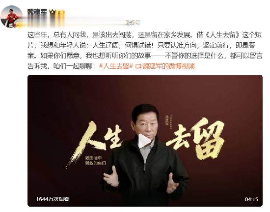 此前,2月22日,魏建军发布短片《人生去留》对年轻人表示:人生辽阔,何惧试错!只要认准方向,坚定前行,即是答案。