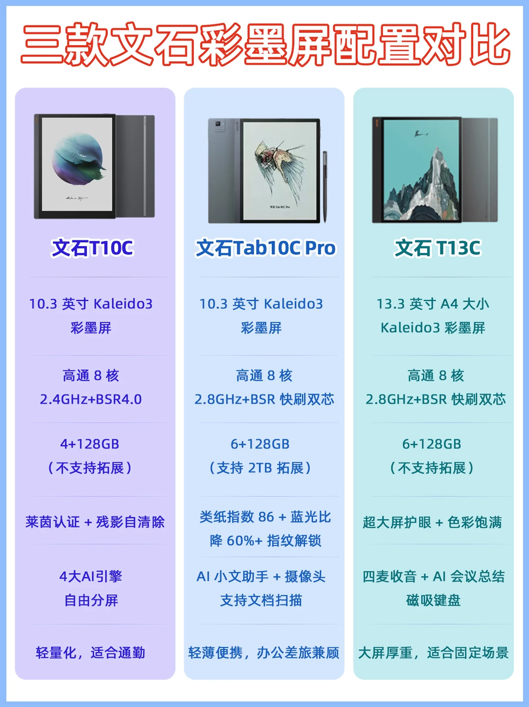 比 T13C和Tab10CPRO 更便宜,重量也是三个里面较轻的,便携性拉满,适合新手入门,有大量读写需求,3000多元就能买到彩墨平板天花板,性价比真的高!