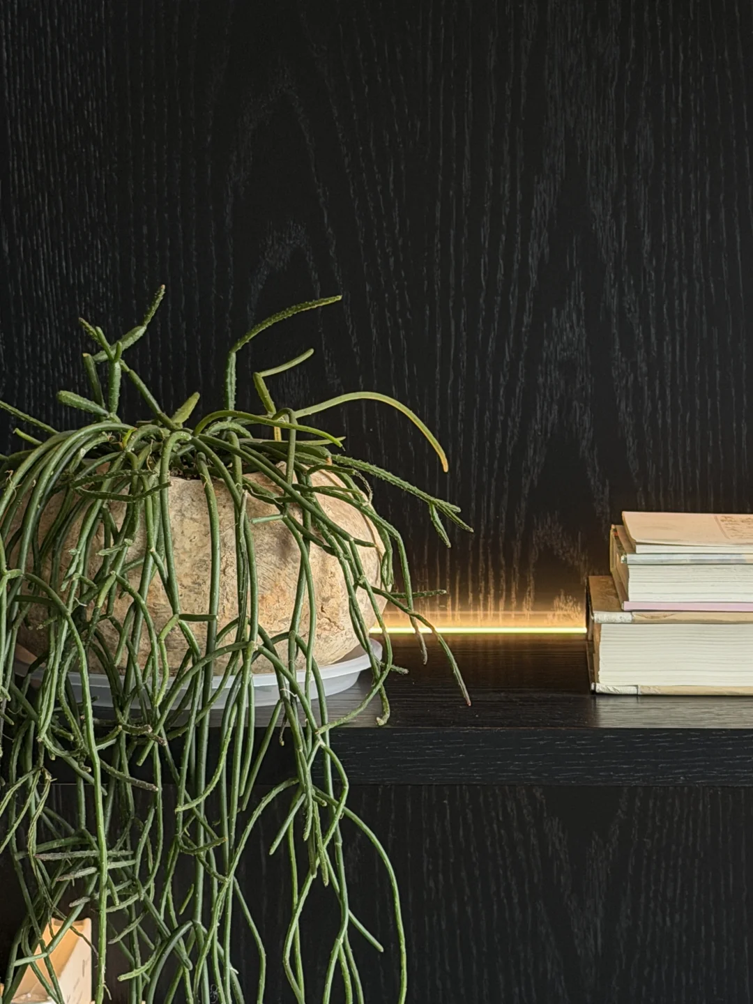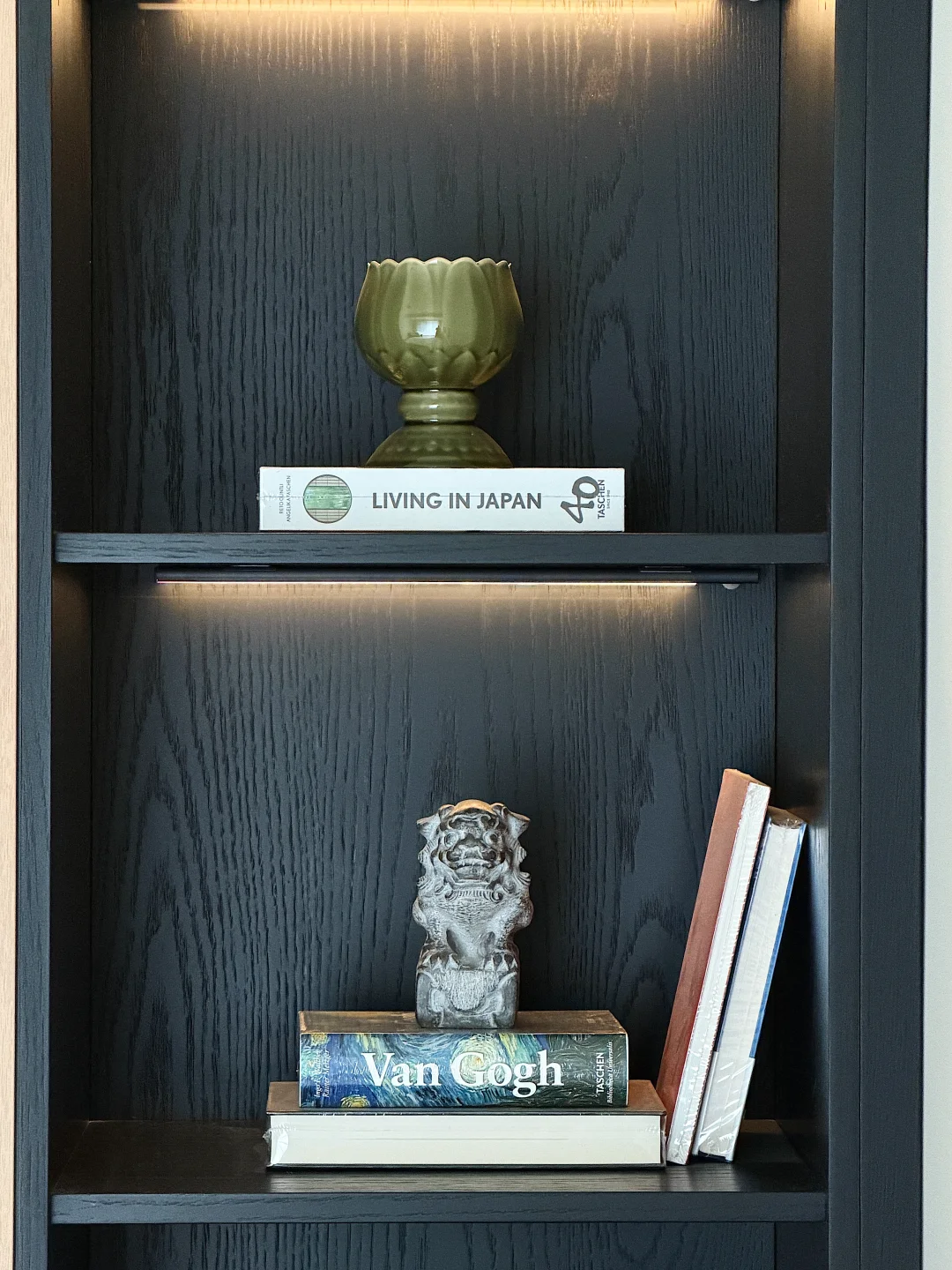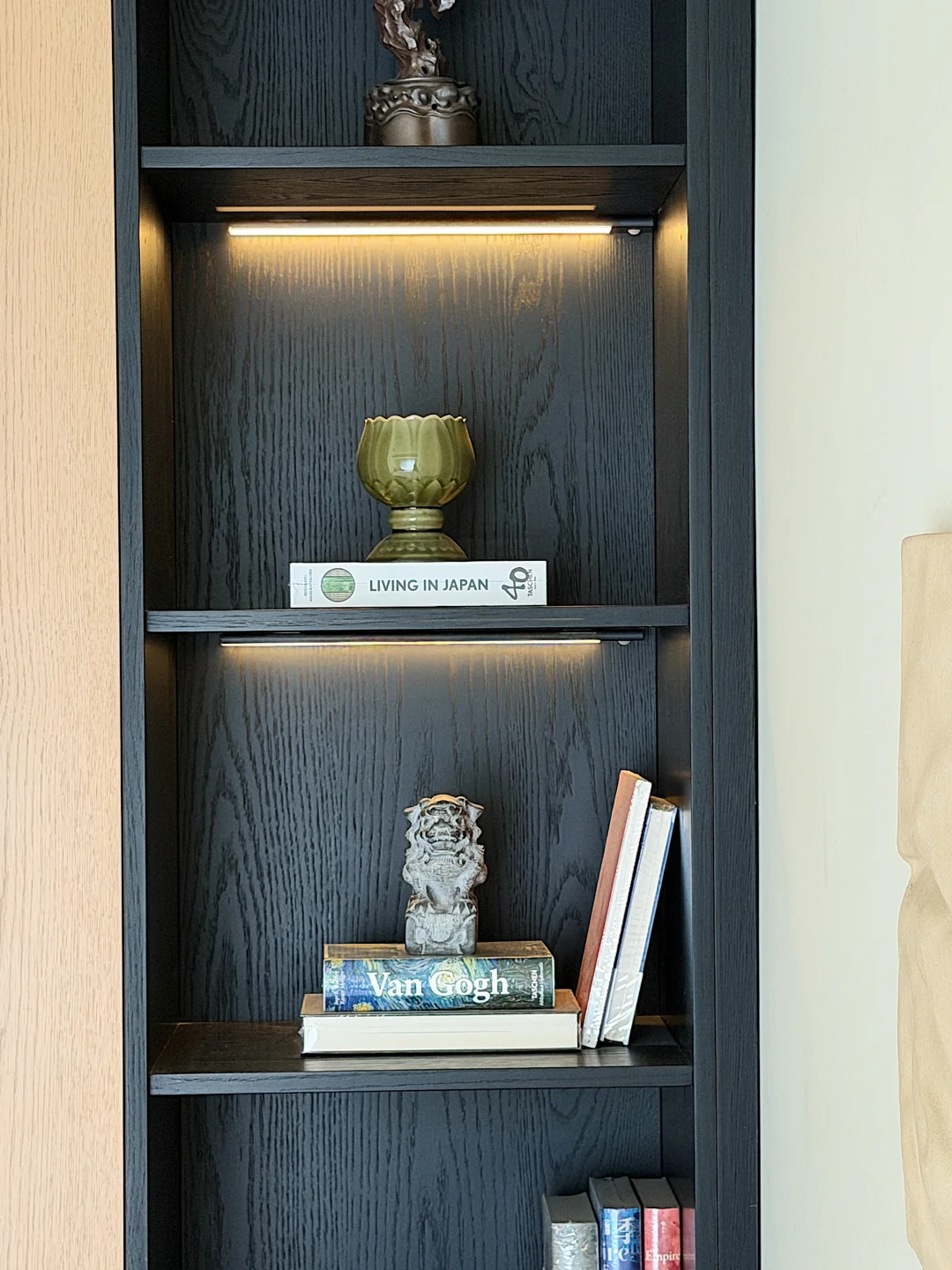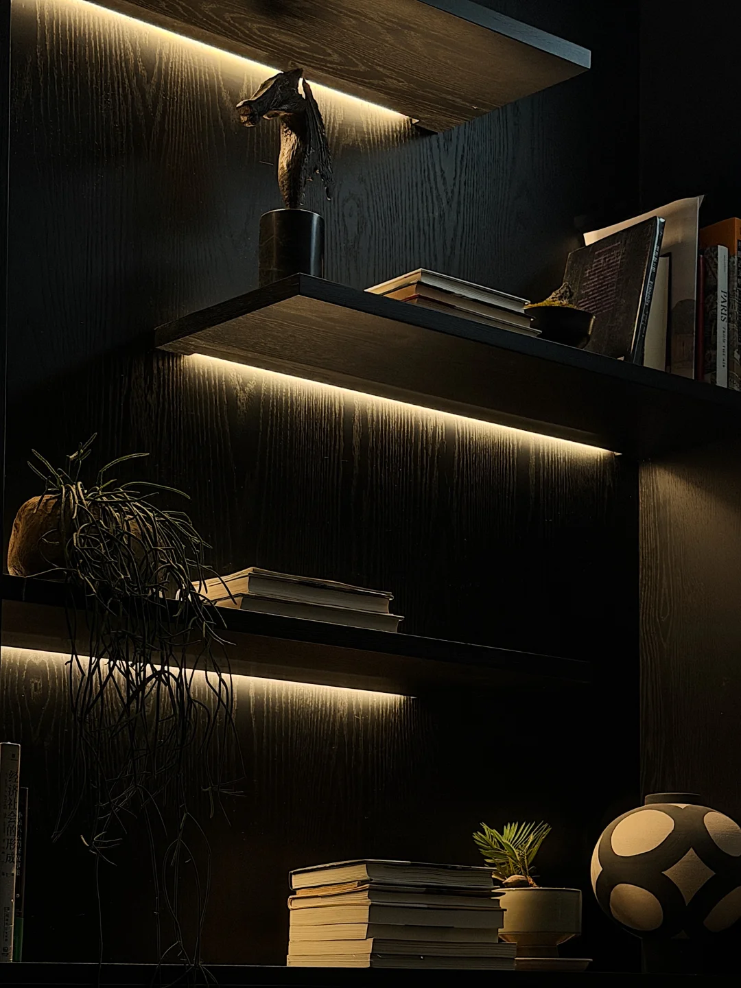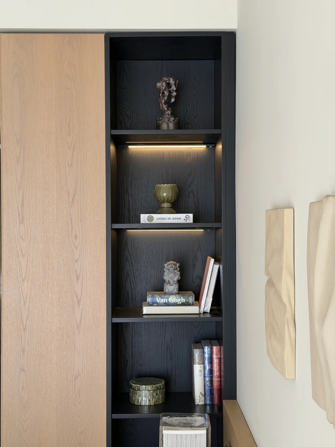 起初,我家全屋定制主卧壁龛并没有预埋装饰灯,其余地方都有做,前段时间愈发觉得深色壁龛其实有组装饰灯很显效果,于是各种研究,终于找到了后装且相对美观的解决方案。