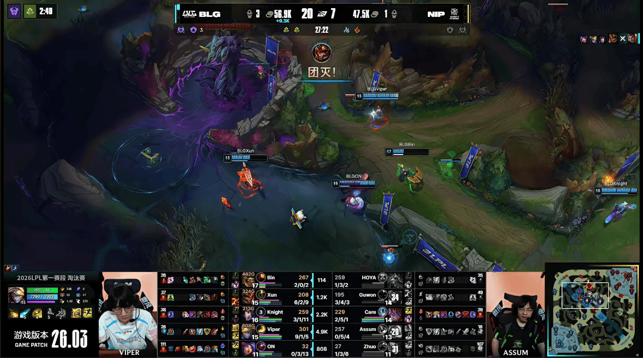 24分钟,BLG团战站位更优,Assum率先被秒BLG完成2换4团战