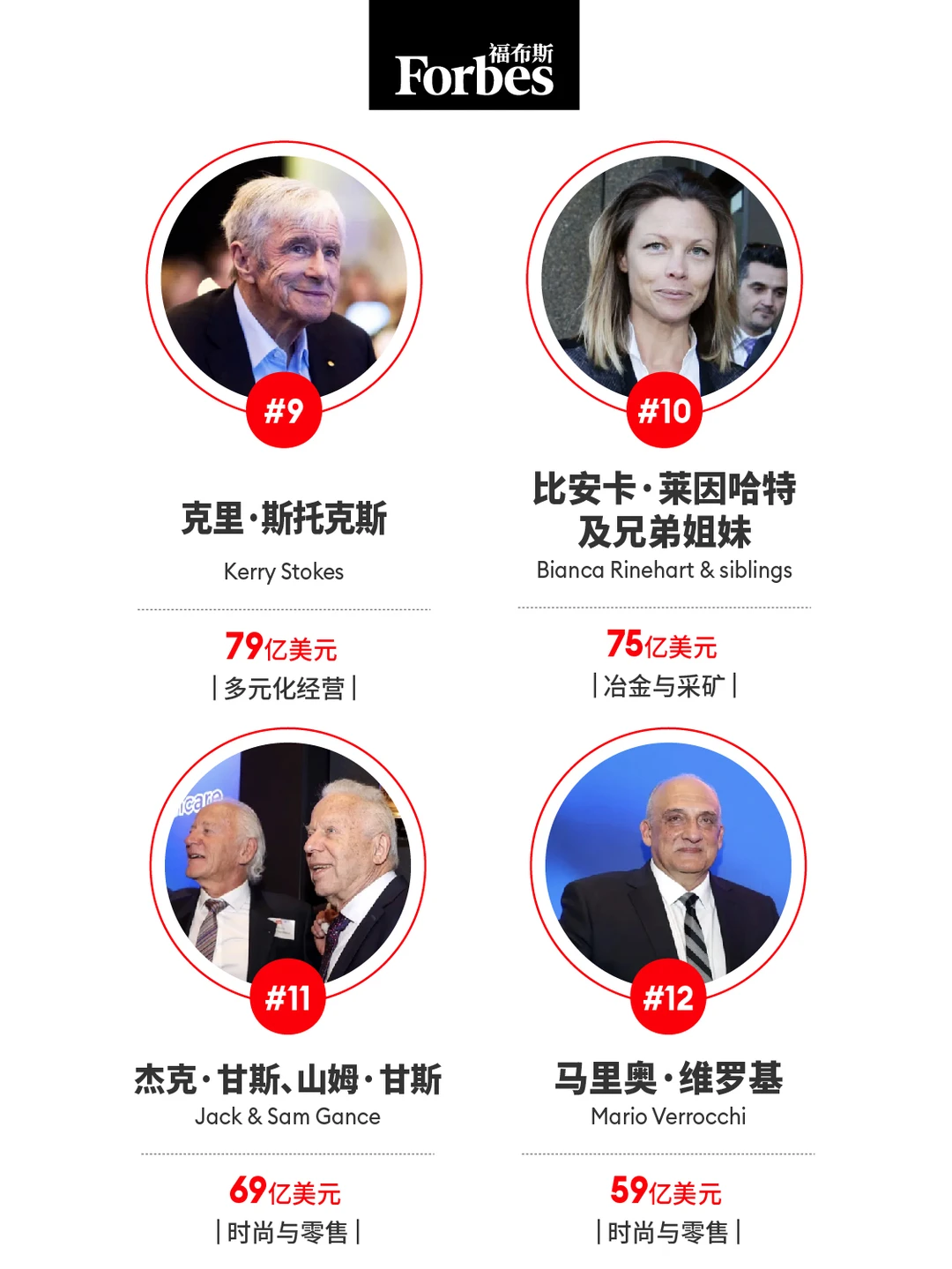 连锁药房Chemist Warehouse的三位联合创始人杰克·甘斯(Jack Gance)及山姆·甘斯(Sam Gance)兄弟和马里奥·维罗基(Mario Verrocchi)在将公司与澳大利亚证券交易所上市公司Sigma Healthcare合并后排名大幅跃升。该交易使三人财富增长至原来的三倍,身家分别达到69亿美元和59亿美元。