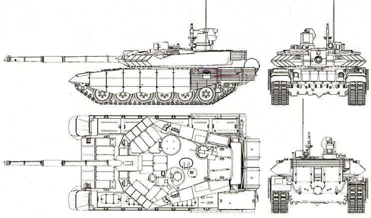 T-90坦克的炮塔位于车体中部,动力舱后置。车尾通常装有自救木和附加油箱,发动机排气口位于车体左侧最后一个负重轮上方。炮塔前端加装了两层复合装甲特别加强,这种复合装甲通常采用特殊塑料和陶瓷制成。车体两侧各有6个负重轮,主动轮后置,诱导轮前置。行动装置上部遮有侧裙板,裙板靠车前端部分装有附加的大块方形装甲板。T-90坦克采用输出功率最大可达930千瓦的柴油发动机,可以越过2.8米宽的壕沟和0.85米高的垂直矮墙,并能通过深达1.2米的水域,在经过短时间准备之后,涉水深度可达5米。